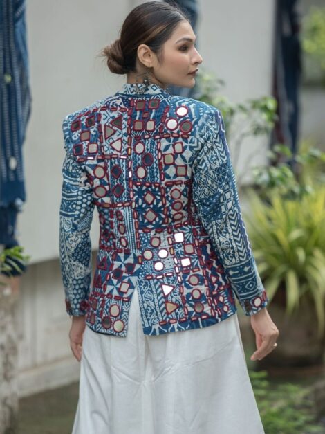 Ritu Kumar Geometric Printed Mock Collar Padded Jacket with Embroidered Detail