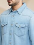 Blue solid opaque Casual shirt ,has a spread collar, button placket, na pocket, long regular sleeves, curved hem