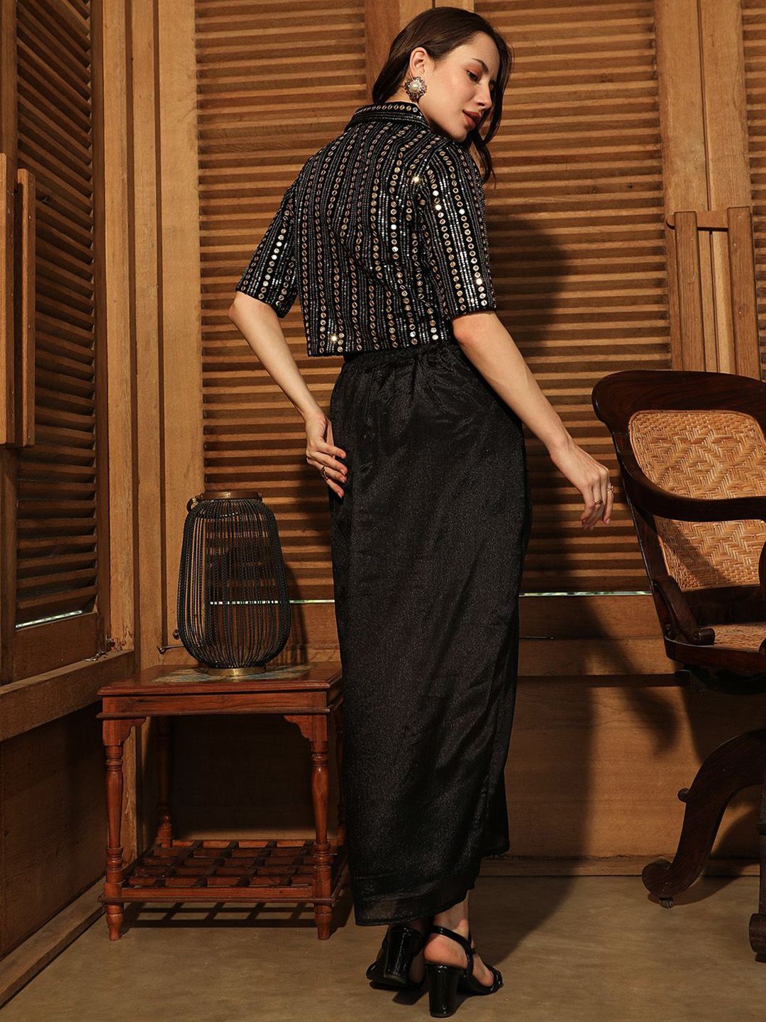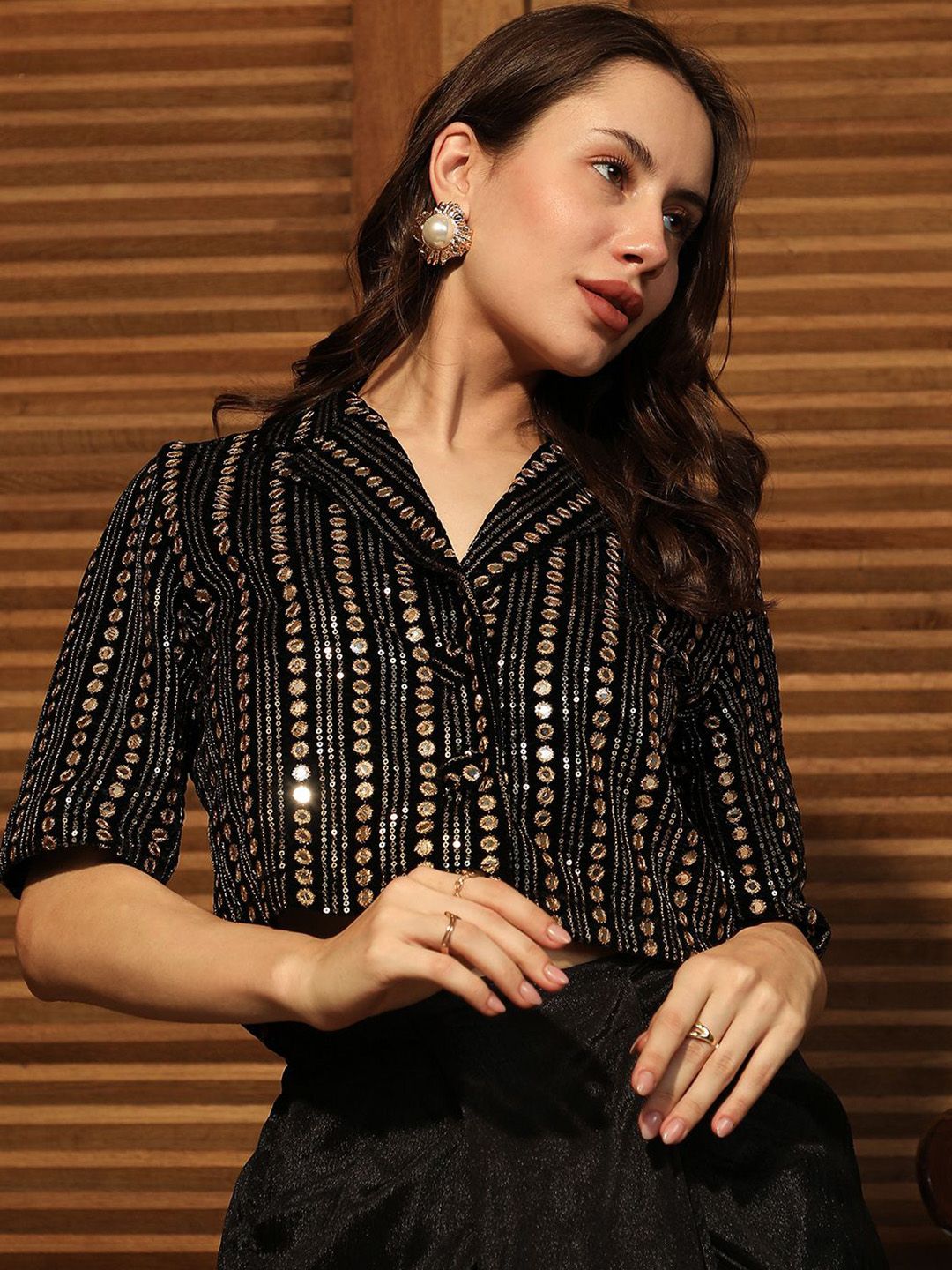 Black embellished top, has a shirt collar neck and short sleeves, Secured with button closure