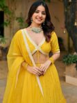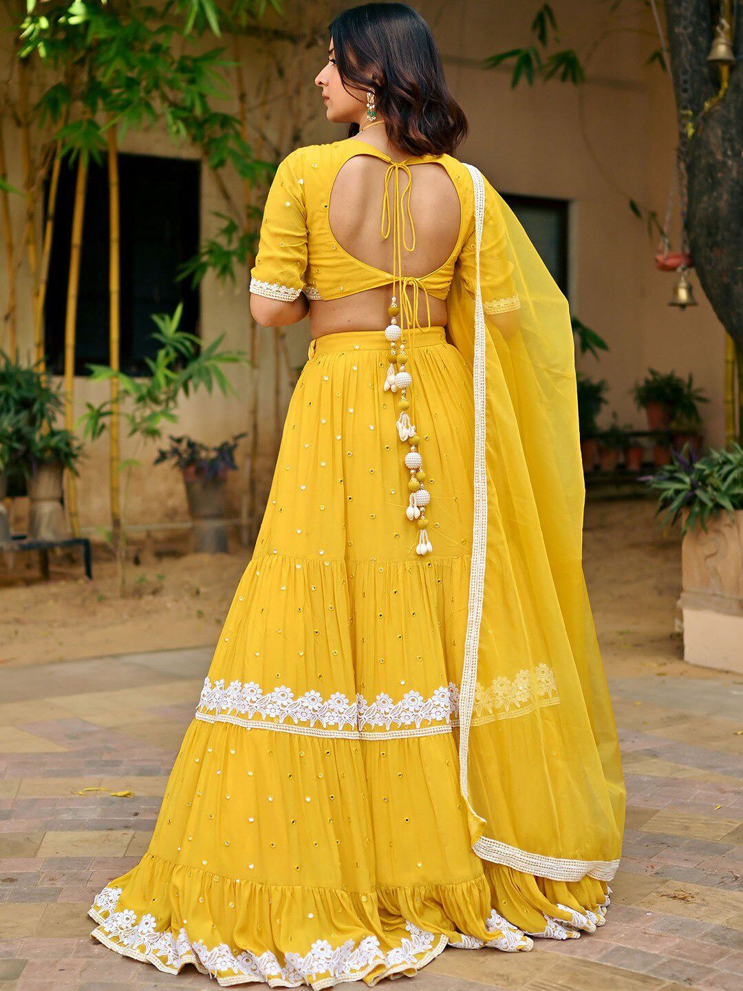 Yellow and white embroidered ready to wear blouse, has a v-neck, short sleeves, yellow and white embroidered ready to wear lehenga, has zip closure, flared hem