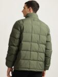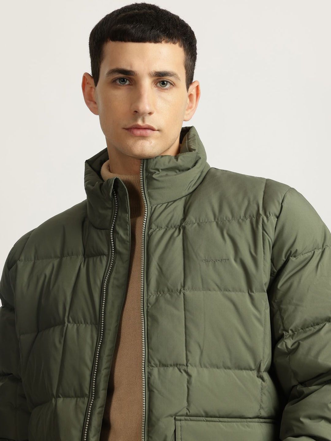 Olive green solid puffer jacket with zip detail, has a mock collar, 2 pockets ,has a zip closure, long sleeves, straight hemline, polyester lining