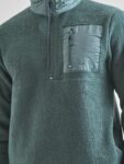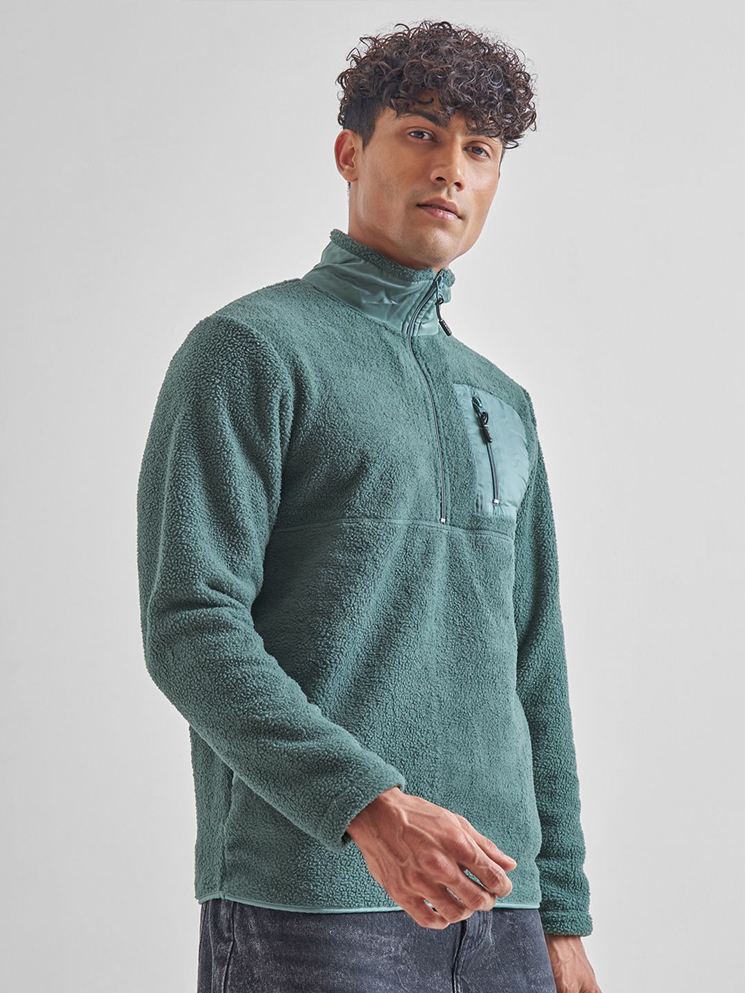 Green solid sweatshirt has a mock collar, 3 insert pockets, long sleeves, half zipper closure, straight hem