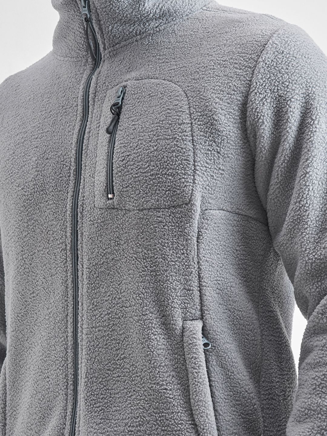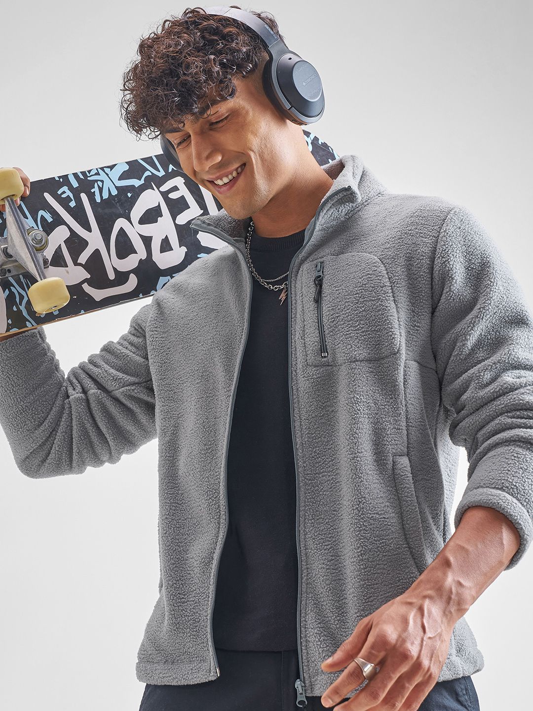 Grey solid sweatshirt, has a high neck, 2 insert pockets, long sleeves, zip closure, straight hem