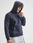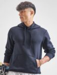 Navy blue solid sweatshirt has a hooded, 2 kangaroo pocket pockets, long sleeves, closure, straight hem