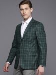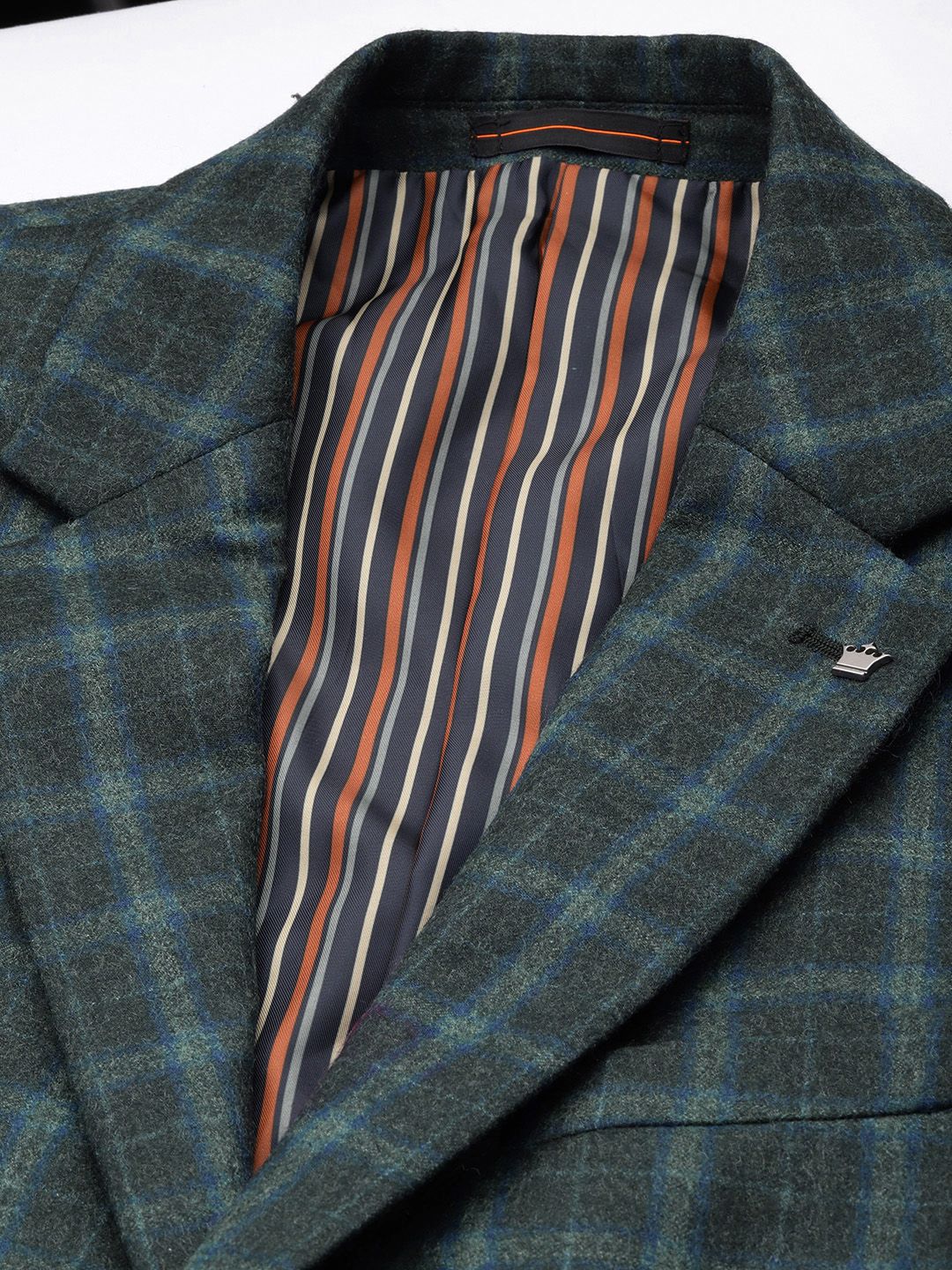 Green checked formal blazer, has a notched lapel, long sleeves, single-breasted with double button closure, two flap pockets, one welt pocket and a double-vented back hem with attached lining
