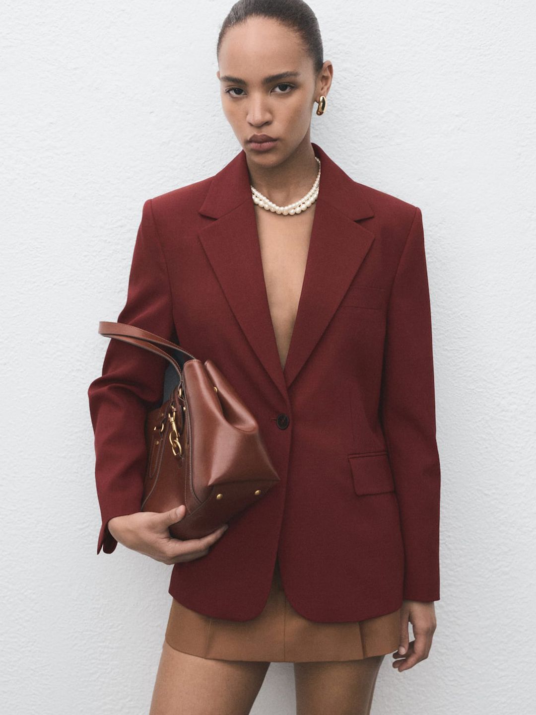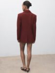 Brown single-breasted blazer has notched lapel collar, long sleeves, 3 pockets and single vent