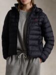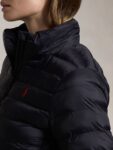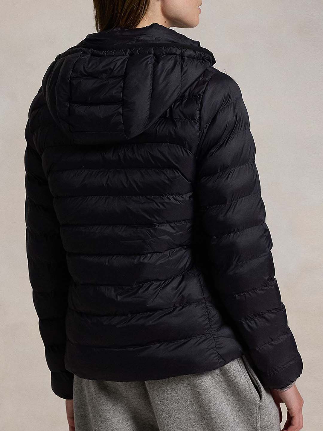 Black solid hooded quilted jacket, has mock collar, zip closure, long sleeves, straight hem, and two pockets