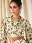 Beige and green printed ready to wear lehenga, has slip-on closure, flared hem