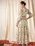 Beige and green printed ready to wear blouse, has a v-neck, long sleeves, slip-on closure