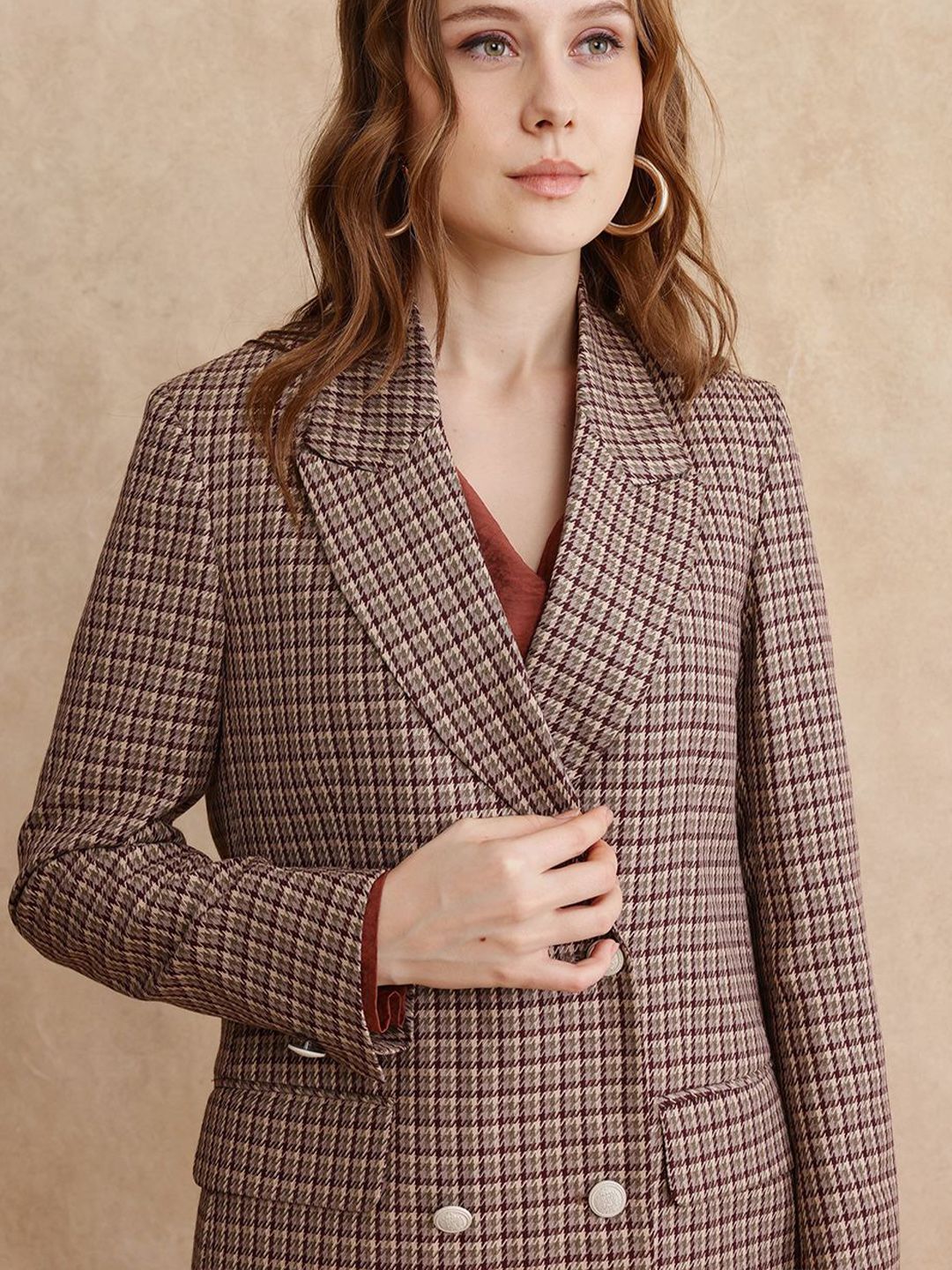 Brown checked slim-fit smart-casual blazer, has a notched lapel, long sleeves, double-breasted with double button closure, two flap pockets, one welt pocket and a ventless back hem