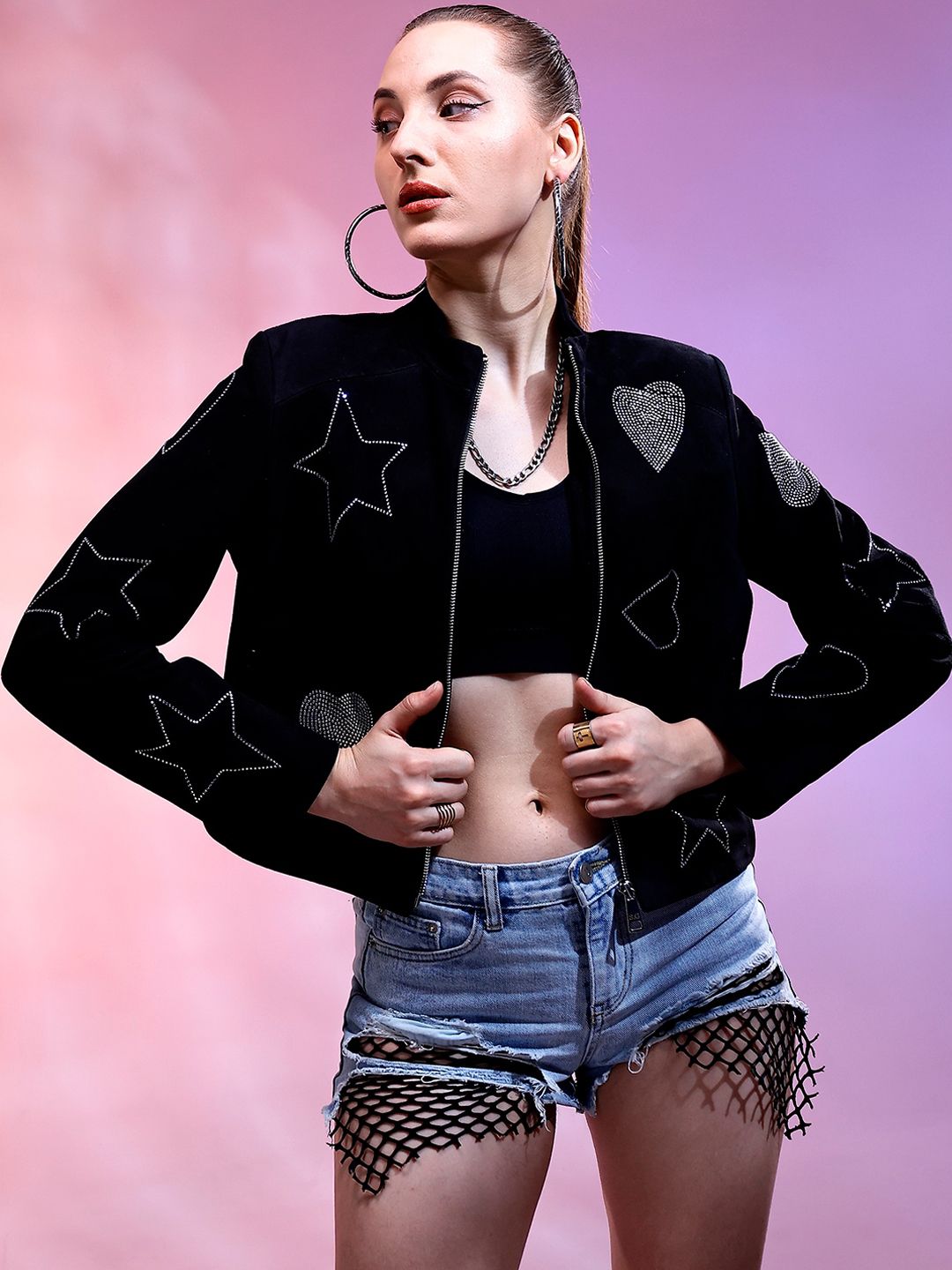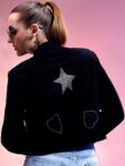 Black graphic printed water resistant biker jacket , has a stand collar, 3 pockets ,has a button closure, long regular sleeves , curved hemline, satin lining