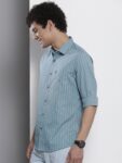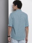Blue pinstripes striped opaque Casual shirt ,has a cutaway collar, button placket, 1 patch pocket, long regular sleeves, curved hem