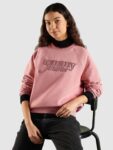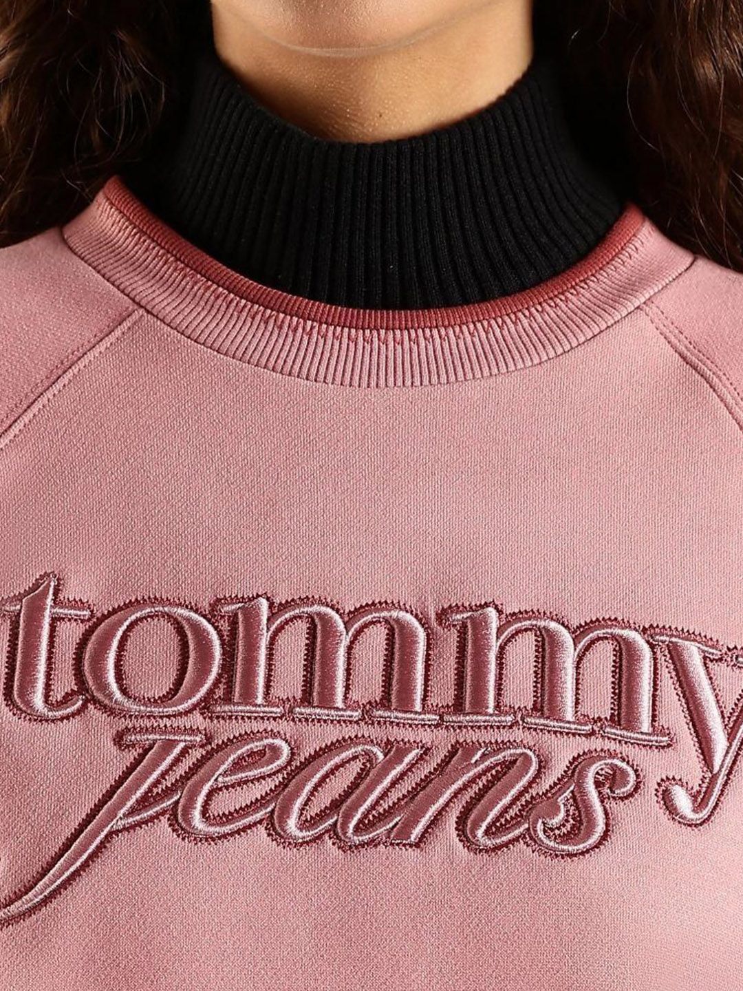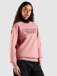 Pink printed sweatshirt has a round neck, na pockets, long sleeves, closure, ribbed hem