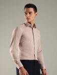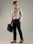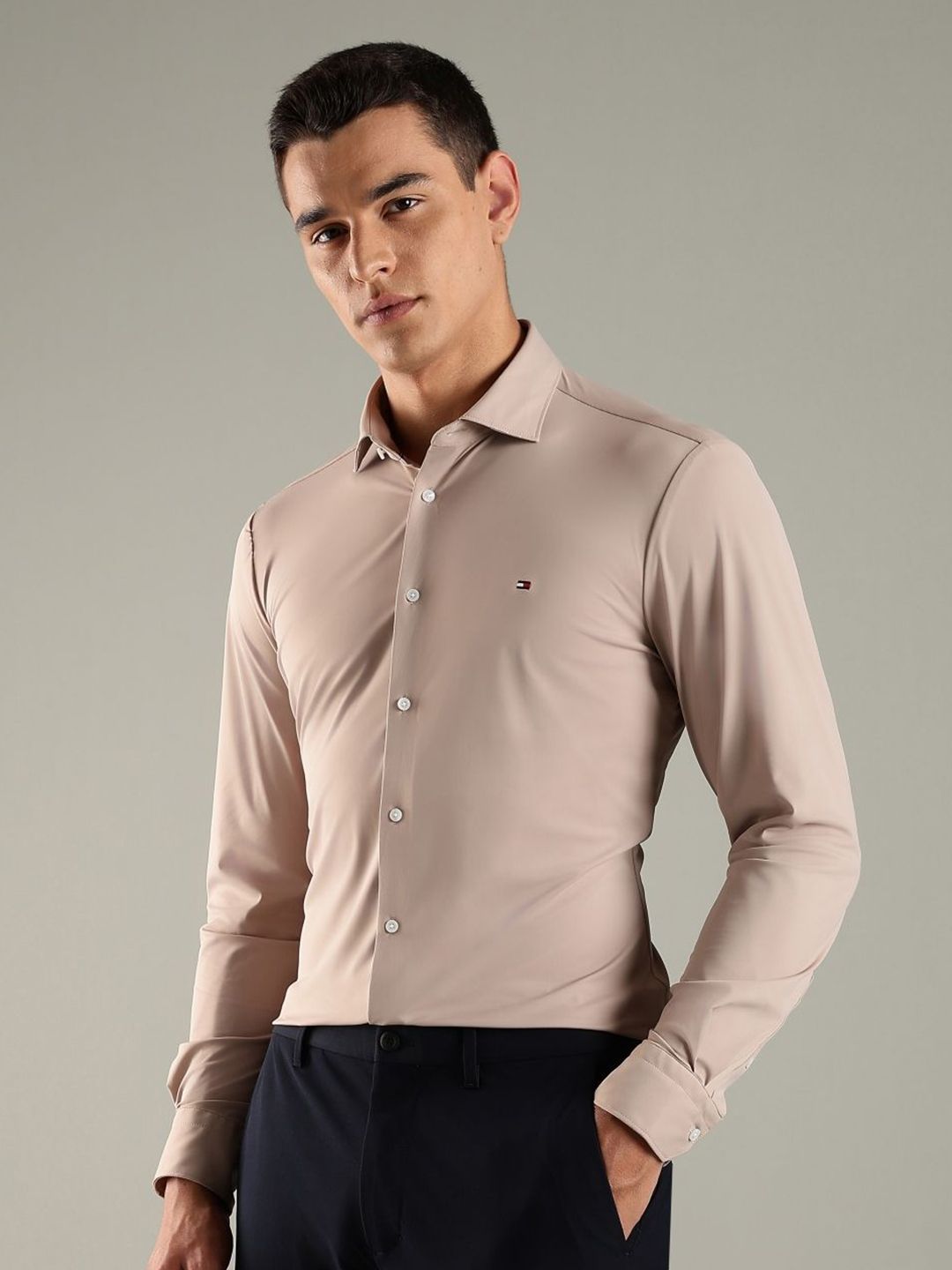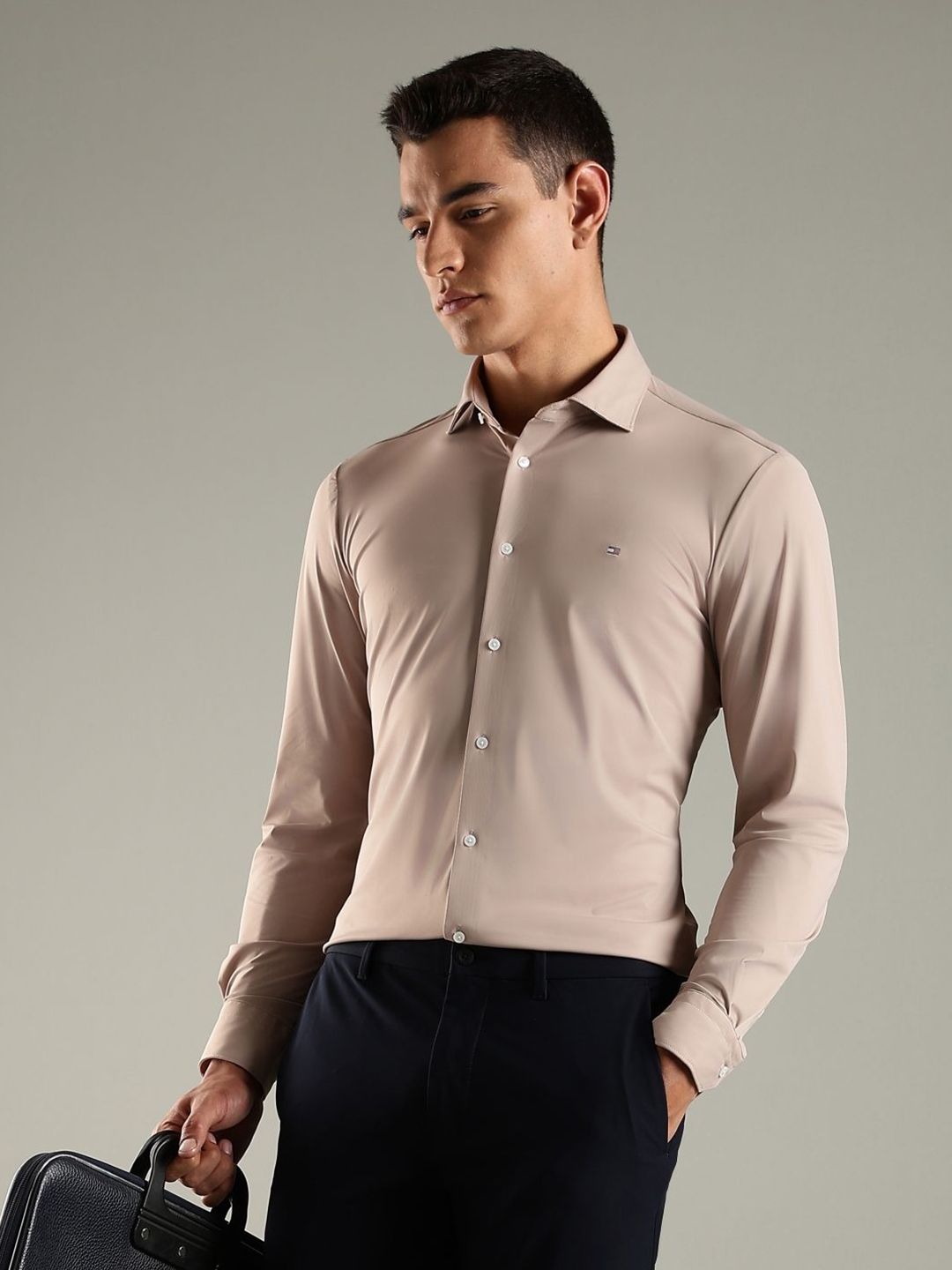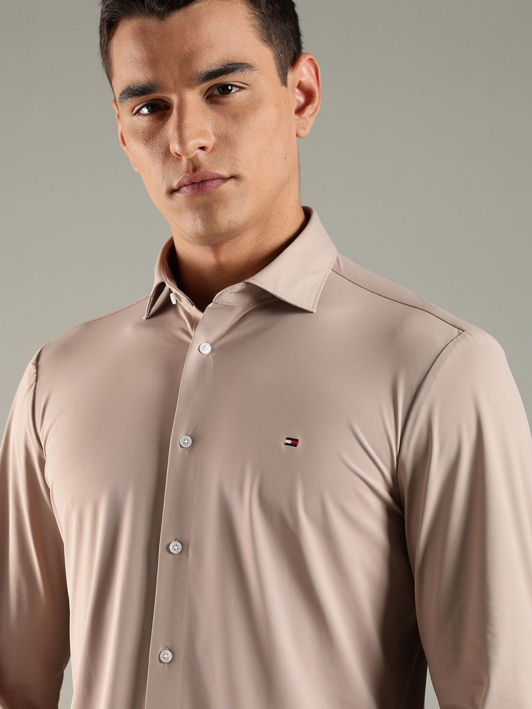 Beige opaque formal shirt for men Spread collar Button placket Curved hemline Solid Regular length Long sleeves