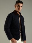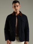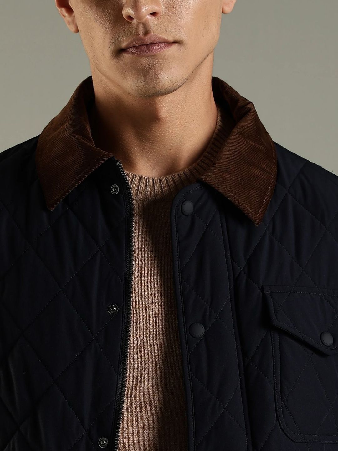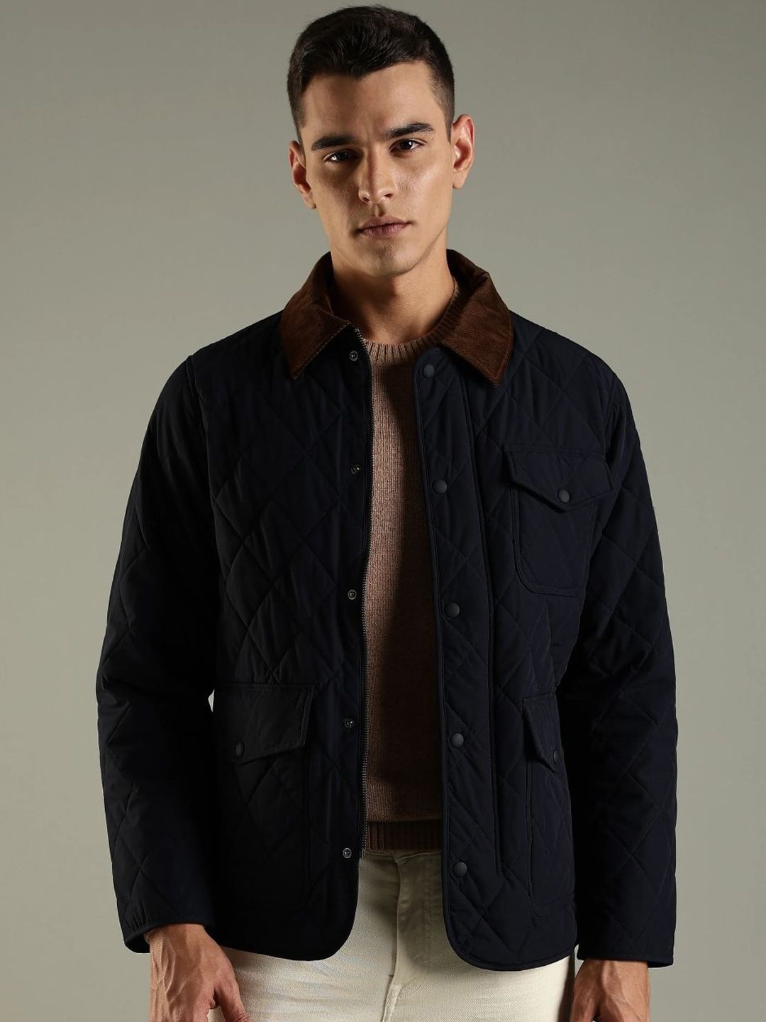 Blue solid open front jacket, has a spread collar, 3 pockets ,has a snap button closure, long sleeves, straight hemline, without lining