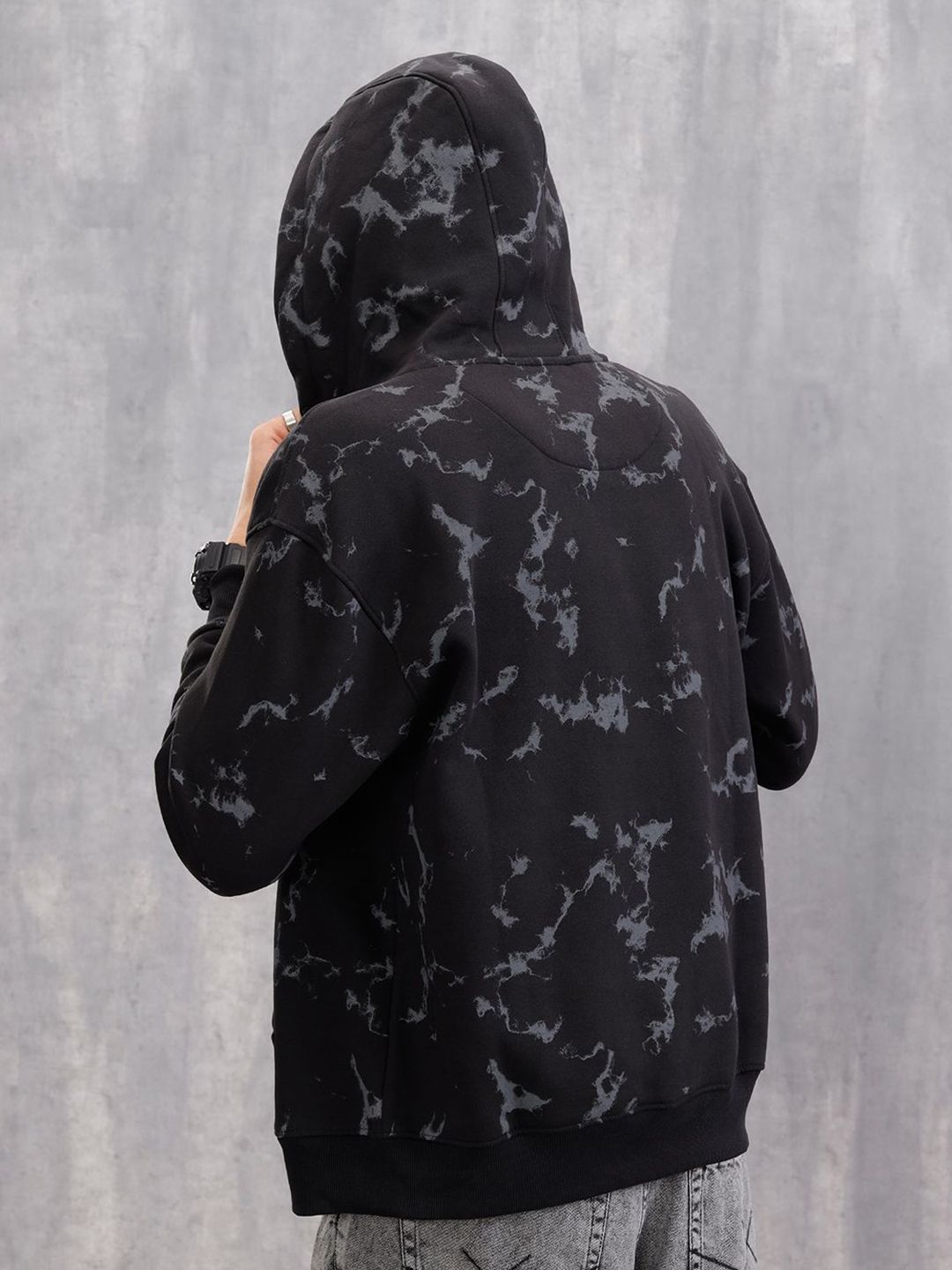 Black printed sweatshirt has a hooded, na pockets, long sleeves, closure, straight hem